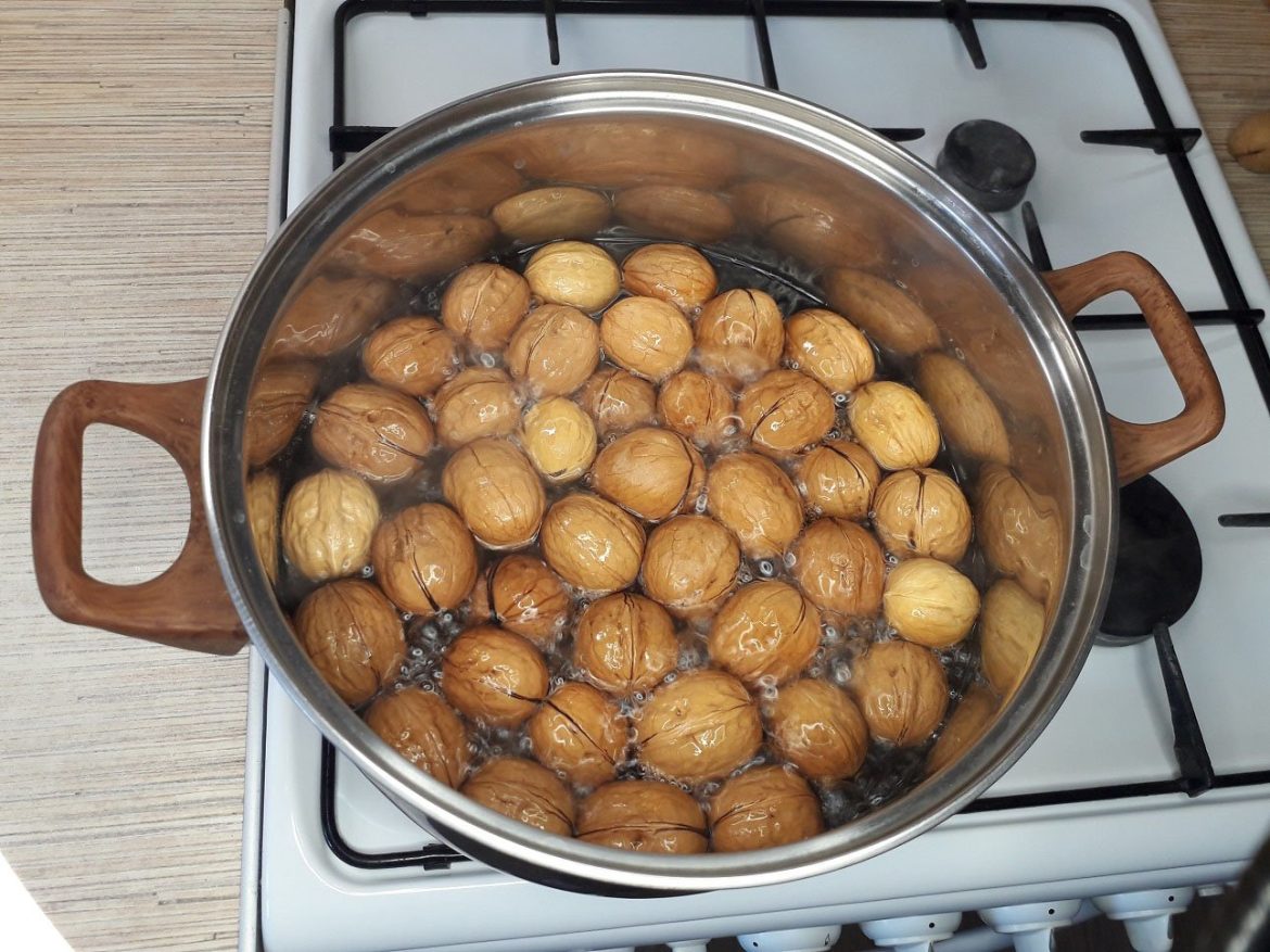 Először is, a gyümölcsöket lemossák a portól, törmeléktől és egyéb szennyeződésektől. Ezután a diót egy serpenyőbe tesszük, és felöntjük forrásban lévő vízzel.